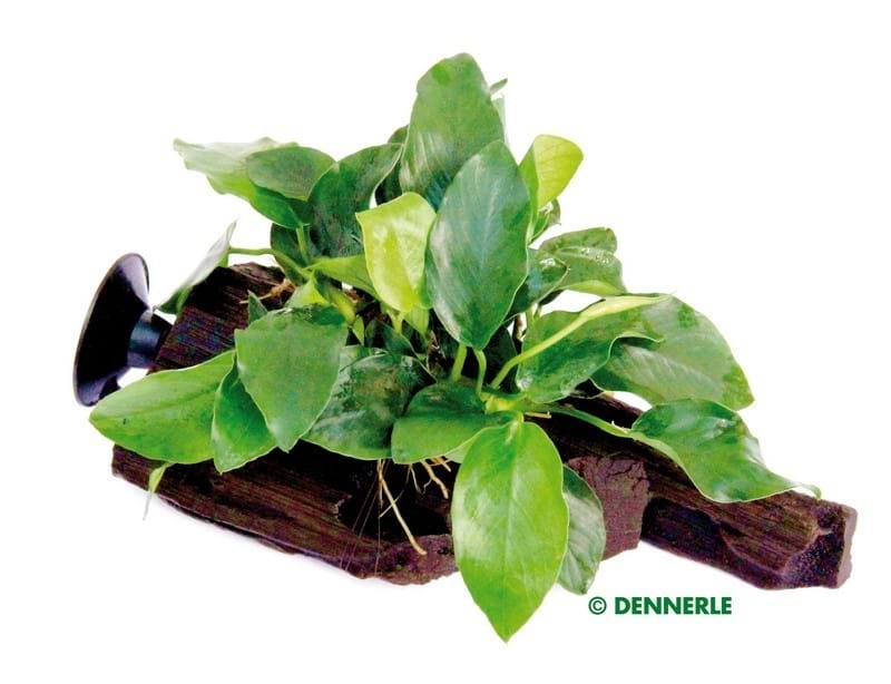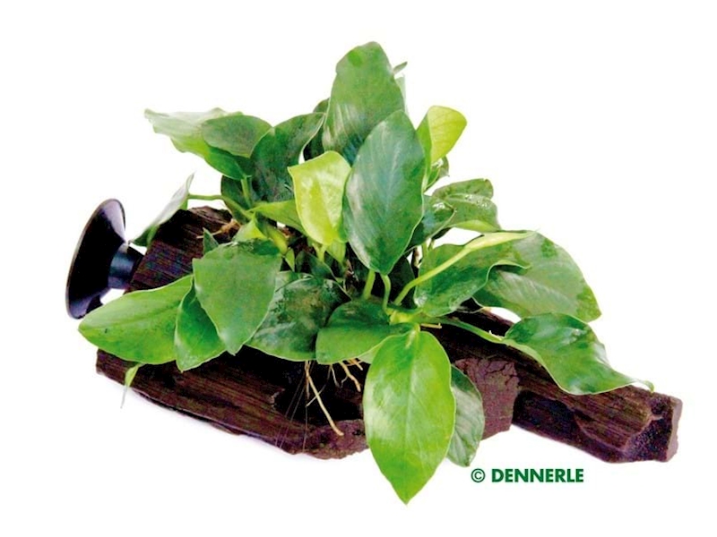 Pro jemně tvarované kořenové dřevo s přísavkami je ideální volbou malolistý Anubias barteri var. nana. Podle celkového designového záměru jej lze připevnit buď na zadní stěnu skla, nebo na boční sklo akvária. Různé kombinace dřevin, například v podobě schodišťového uspořádání, pak ještě více podtrhnou atraktivní a přírodní vzhled celé scény.