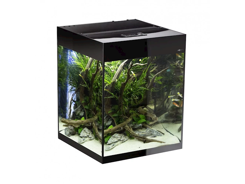 GLOSSY CUBE set ve tvaru tzv. "kostky" obsahuje osvětlení a ozdobný černý rám nalepený na vnitřní straně akvária. Tímto způsobem byl získán efekt jednotné skleněné desky od základny k hornímu okraji nádrže. V kombinaci se skříňkou na doplňky vysokou 90 cm, s dvířky z desek s vysokým leskem, vytváří mimořádně dekorativní efekt. Díky tomu se sestava GLOSSY CUBE skvěle hodí do všech moderních interiérů.