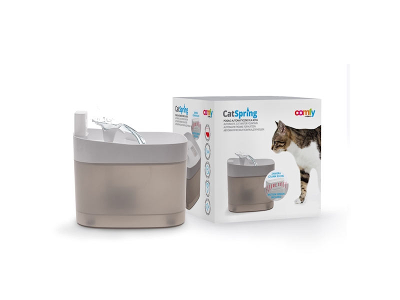 CatSpring je průtoková napáječka pro kočky a psy. Je vybavena pohybovým senzorem, který spustí proud vody pouze tehdy, když zaznamená pohyb, například blížící se kočku. Přítomnost pohybového senzoru zajišťuje nižší spotřebu energie, minimalizuje zvuky tekoucí vody a z dlouhodobého hlediska může prodloužit životnost výrobku.