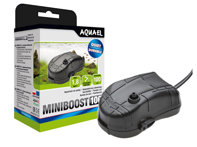 MINIBOOST 100 a 200 je určen pro majitele malých a středních akvárií (s kapacitou až 100 l). Je navržen tak, aby umožňoval účinné provzdušňování vody v nádrži. Kromě toho může být zařízení použito k pohonu běžných houbačkových filtrů (v současné době převážně používaných v cisternách a akváriích, kde se chovají rybky). Jak již bylo zmíněno, zařízení je velmi malé (jen 8,5 x 4 x 4 cm - miniboost 100), což znamená, že je nenápadný a nezabírá mnoho místa. Praktický knoflík umožňuje plynulé nastavení výkonu. Můžete jej použít k přizpůsobení proudění vzduchu potřebám i těch nejmenších akvárií. Díky speciální konstrukci je membrána obzvláště trvanlivá, takže může zůstat v provozu po dlouhou dobu bez nutnosti výměny. V tomto případě aerátor spotřebuje pouze 1,8 W elektrické energie a je velmi levná.