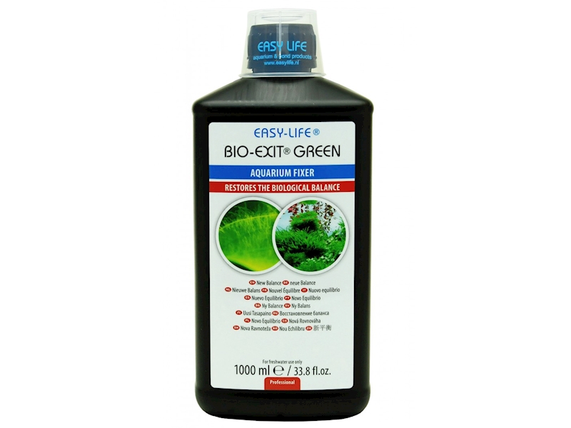 Mikrobiologická nerovnováha v akváriu může způsobit, že rostliny rostou špatně a že z nich unikají cukry. Tyto cukry mohou sloužit jako zdroje živin pro nevzhledné řasy (např. řasy vousové, vláknité, kartáčové řasy a hnědé). Bio-Exit Green obnovuje biologickou rovnováhu tím, že brání úniku cukrů z rostlin tím, že dodává do akvária unikátní směs specifických organických kyselin a růstových stimulátorů.