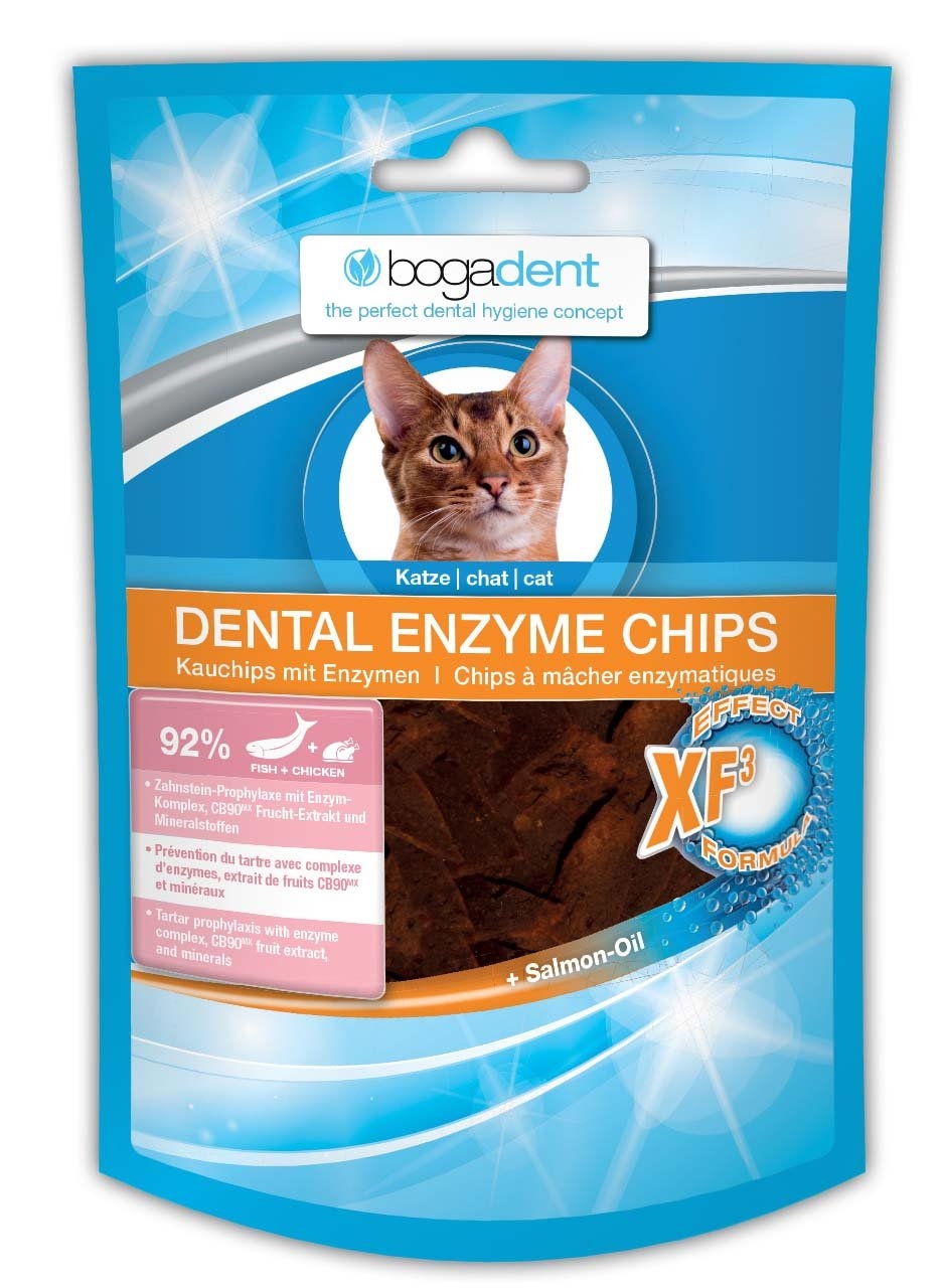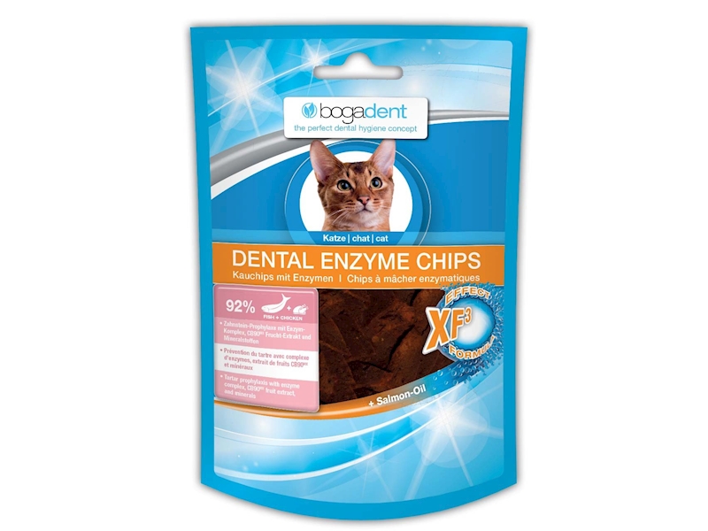 bogadent® DENTAL ENZYME CHIPS jsou lahodné chipsy pro péči o zuby vyrobené z 92% ryb a masa. Přírodní enzymy z koncentrované syrovátky, brusinek, společně s minerály, díky inovativnímu vzorci XF3-Effect-Formula, pomáhají snižovat tvorbu zubního kamene a mohou přispět k udržení zdravých dásní. Takto spojíte každodenní aktivní dentální hygienu s odměnou.