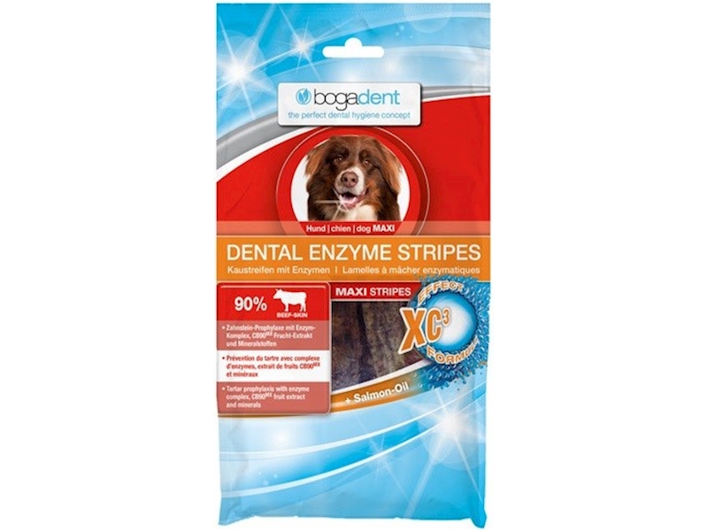 Bogadent DENTAL ENZYME STRIPES jsou ideálním řešením spojení péče o zuby a žvýkacího potěšení. Inovativní XC3-effect-Formula je založena na přírodních enzymech z koncentrované syrovátky a 2 dodatečných látkách ( ovocný extrakt CB90MX, minerální látky). Chrání před tvorbou zubního plaku a kamene a zabraňuje podráždění dásní. Obzvlášť chutná hovězí kůže DENTAL ENZYME STRIPES čistí zuby při žvýkání.