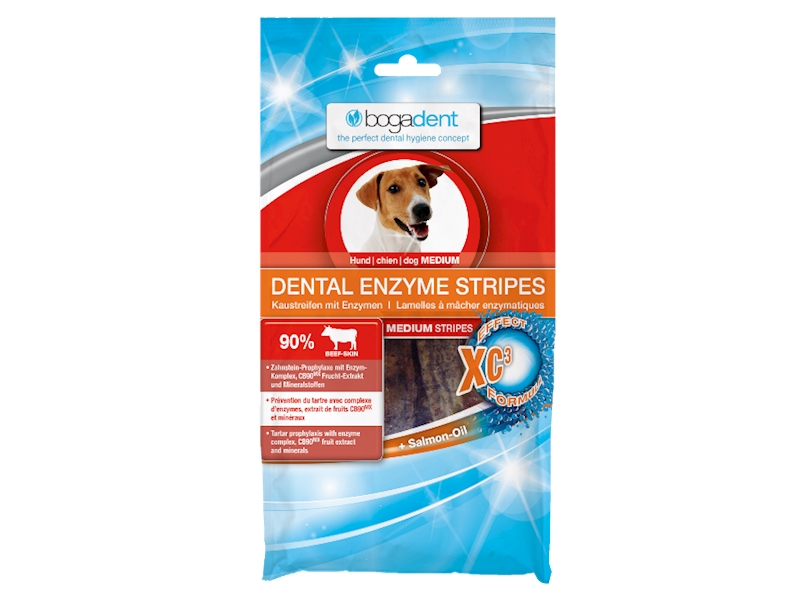 Bogadent DENTAL ENZYME STRIPES jsou ideálním řešením spojení péče o zuby a žvýkacího potěšení. Inovativní XC3-effect-Formula je založena na přírodních enzymech z koncentrované syrovátky a 2 dodatečných látkách (ovocný extrakt CB90MX, minerální látky). Chrání před tvorbou zubního plaku a kamene a zabraňuje podráždění dásní. Obzvlášť chutná hovězí kůže DENTAL ENZYME STRIPES čistí zuby při žvýkání.