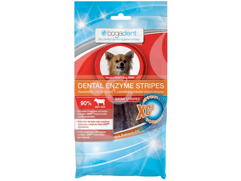 Bogadent DENTAL ENZYME STRIPES jsou ideálním řešením spojení péče o zuby a žvýkacího potěšení. Inovativní XC3-effect-Formula je založena na přírodních enzymech z koncentrované syrovátky a 2 dodatečných látkách ( ovocný extrakt CB90MX, minerální látky). Chrání před tvorbou zubního plaku a kamene a zabraňuje podráždění dásní. Obzvlášť chutná hovězí kůže DENTAL ENZYME STRIPES čistí zuby při žvýkání.