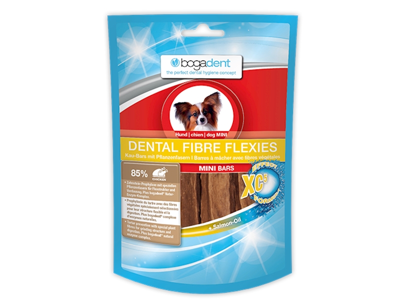 bogadent DENTAL FIBER STICKS jsou chutné pamlsky pro péči o zuby malých psů, vyrobené z 85 % kuřecího masa. Rostlinná vlákna (speciální celulóza) zlepšují a prodlužují žvýkací proces a podporují vylučování chuchvalců srsti. Přírodní enzymy a dvě další aktivní složky (ovocný extrakt CB90MX, minerály) chrání proti tvorbě plaku a zubního kamene a mohou zabránit zánětu dásní. Funkční efekt a příjemné žvýkání.