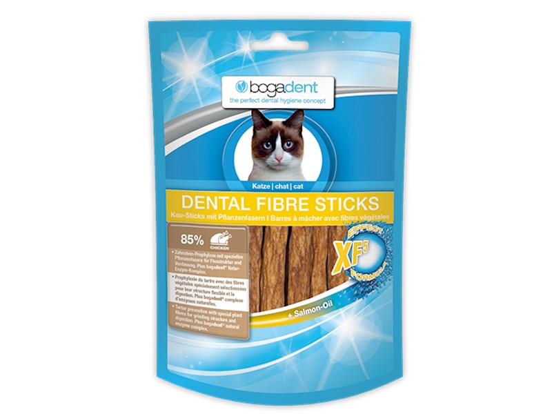 bogadent DENTAL FIBER STICKS jsou chutné pamlsky pro péči o zuby koček, vyrobené z 85% kuřecího masa. Rostlinná vlákna (speciální celulóza) zlepšují a prodlužují žvýkací proces a podporují vylučování chuchvalců srsti. Přírodní enzymy a dvě další aktivní složky (ovocný extrakt CB90MX, minerály) chrání proti tvorbě plaku a zubního kamene a mohou zabránit zánětu dásní. Funkční efekt a příjemné žvýkání.