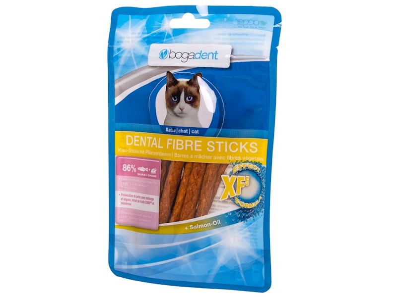 boga dent ® DENTAL FIBER STICKS FISH jsou lahodné tyčinky pro péči o zuby vyrobené z 86% lososa a kuřecího masa. Rostlinná vlákna (speciální celulóza) zlepšují a prodlužují proces žvýkání a podporují odstraňování chlupů. Přírodní enzymy a 2 další aktivní složky (brusinka, minerály) chrání před tvorbou plaku a zubního kamene a mohou předcházet podráždění dásní. Funkční efekt plus příjemné žvýkání.