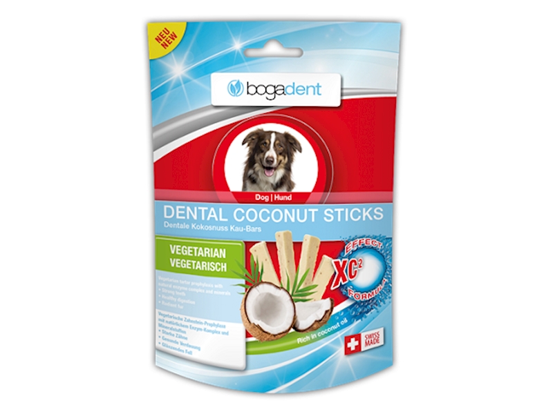 bogadent® DENTAL COCONUT STICKS jsou lahodné vegetariánské tyčinky pro péči o zuby vyrobené z kokosových vloček a doplněné o přírodní enzymy z koncentrovaného syrovátkového proteinu a minerály, které chrání před tvorbou plaku a zubního kamene a mohou předcházet podráždění dásní. Kokosový olej navíc posiluje srst a kůži vašeho psa. Obsažená rostlinná vláknina podporuje trávení vašeho psa a prodlužuje proces žvýkání. Spojujete proto každodenní péči o zuby s odměnou.