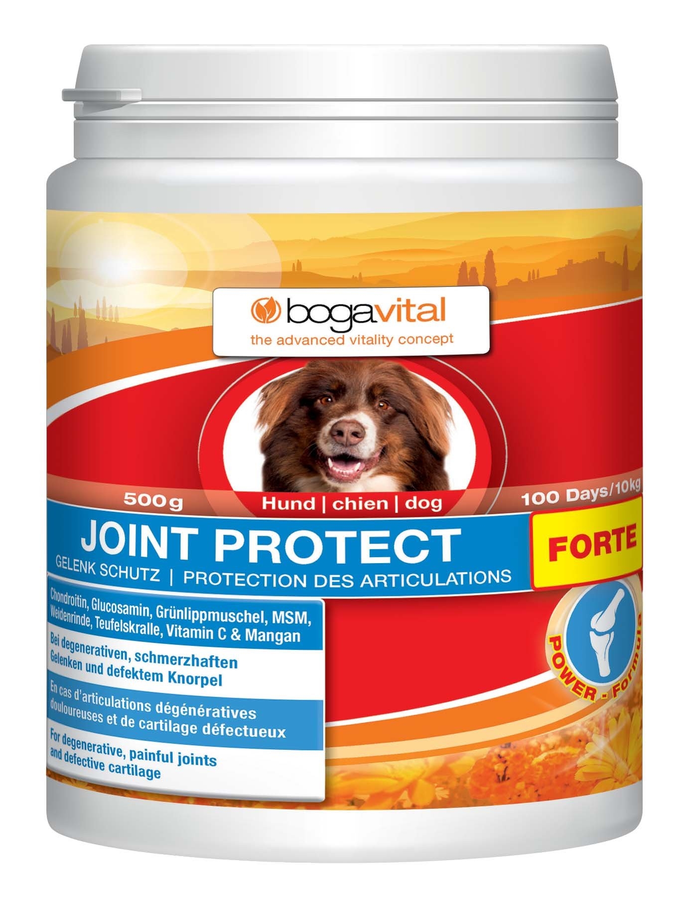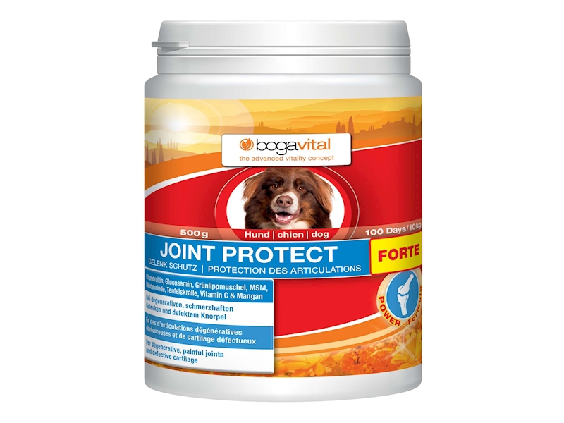 Pravidelný pohyb je předpokladem pro šťastný psí život. Anomálie, nadváha, nehody a operace mohou vést k předčasnému opotřebení kloubů. Střední až velké rasy nebo rasy rychle rostoucí k tomu mají dědičné předpoklady. Pro redukování a předcházení následných symptomů jako je nechuť k pohybu a neohebnost jsme vyvinuli inovativní formuli pro ochranu kloubů. Vysoké dávky vitálních látek jako je chondroitin, glukosamin a slávka zelenoústá tvoří kloubní tekutiny, vyživují chrupavku a tím zlepšují její pružnost. MSM, vrbová kůra a čertův dráp mají na klouby zklidňující účinek, snižují tuhost a zvyšují pohyblivost.