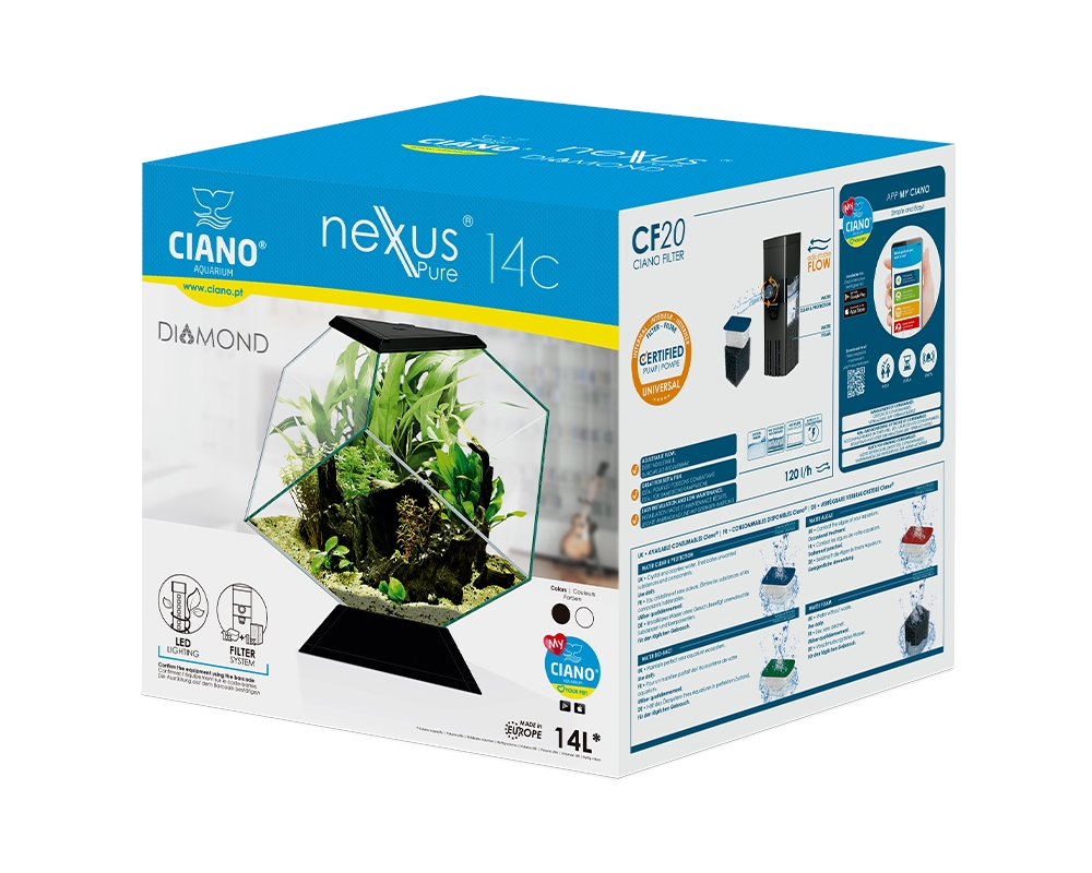 Nexus Pure 14C je vybaven vnitřním filtrem CF20 Ciano® s regulátorem průtoku, díky kterému je skvělý pro malé ryby. Díky trojité filtrační kapacitě udrží vodu křišťálově čistou a bez zápachu.