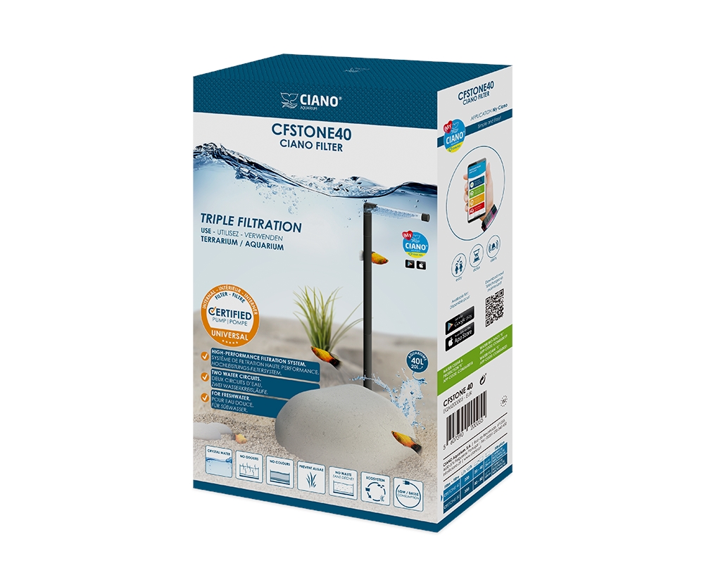 Filtr CFSTONE40 Ciano® je nová generace vnitřního filtru. Design ve tvaru kamene jej „smíchá“ s dekorací akvária. Jedná se o vysoce výkonný filtrační systém se snadnou instalací a nenáročnou údržbou. Dva nezávislé vodní okruhy zajišťují čistotu, úpravu vody a zajišťují kolonizaci bakterií. Ideální pro akvária o objemu 20 až 40 litrů s maximální výškou do 35 cm.