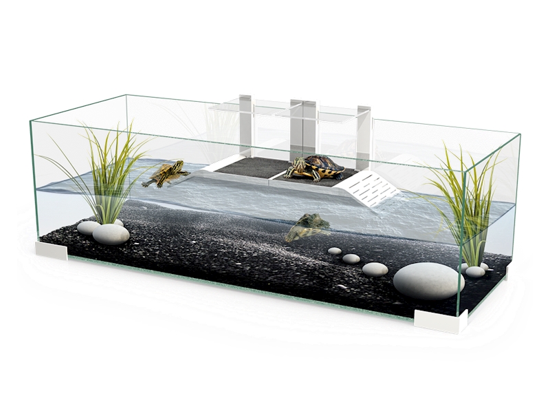 Z vysoce kvalitních materiálů, skla, které umožňuje plný výhled na všechny pohyby želv a bílého plastu s vysokým leskem na jeho čtyřech podpěrách a rampy.