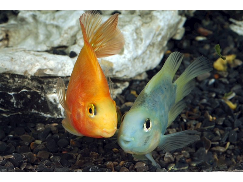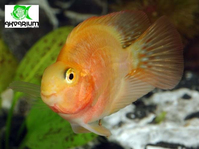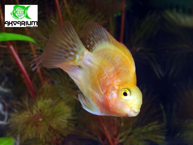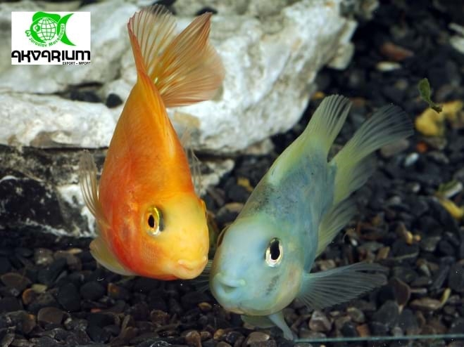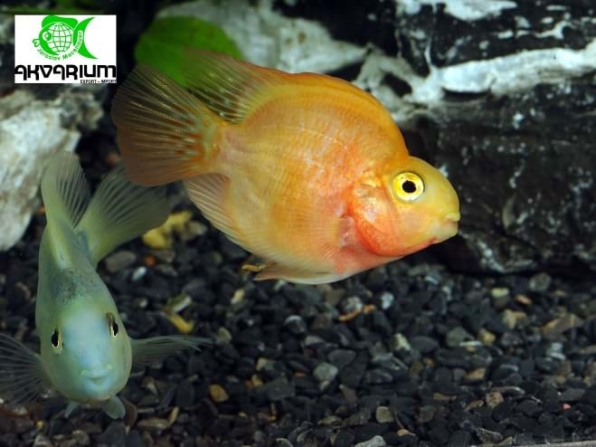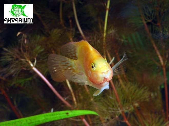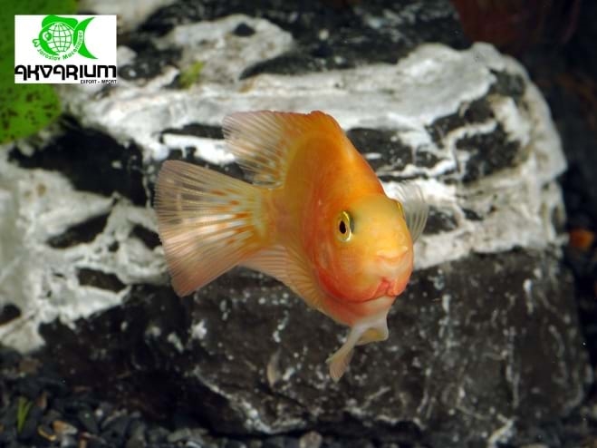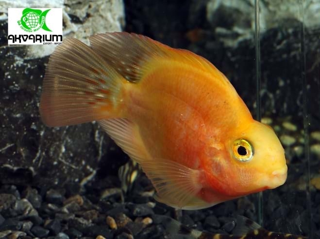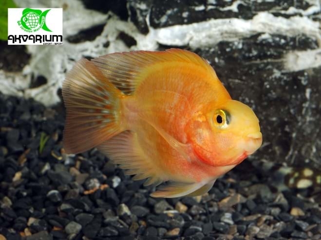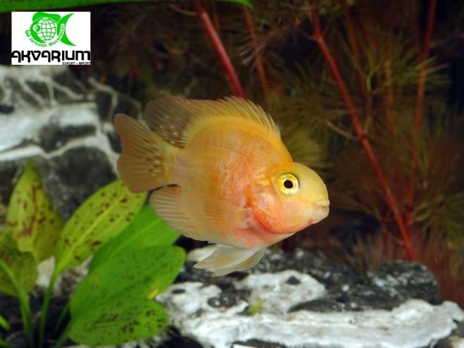 Podrobný popis: Jedná se o jednu z nejvíce kontroverzních akvarijních ryb vůbec. Sluší se připomenout, že název Parrot cichlid (Cichlida papouščí) je stejně umělý, jako celá tato ryba. Skutečná ryba skrývající se pod tímto názvem je překrásná jihoamerická cichlida Hoplarchus psittacus, která je však v akváriích velkou vzácností ( http://www.raubwelse.de/galerie/cichliden/c012.htm ). Po celém světě probíhají diskuse nad touto rybou. Má své zaryté odpůrce, ale i mnoho obdivovatelů. Byla uměle vyrobena na Taiwanu a o jejím přesném původu se informace tají. Její tvar je výsledkem nepřirozených mutací. Tělo je zavalité, s deformovanou páteří, takže vytváří dojem papouščího zobáku. Deformovaná je i hlava a ryby tak nejsou schopny zcela zavřít tlamku. Jejich neohrabané plavání má na svědomí deformovaná páteř a deformace plynového měchýře (to často vede k poruchám rovnováhy). Jsou poměrně náchylné na nemoci, obzvlášť pokud teplota klesne pod 21 °C. V případě chovu těchto ryb je také nutná kvalitní filtrace a pravidelné odkalování (produkují hodně detritu). Z rostlin lze v nádrži mít jen odolné druhy. Rozhodně nechovat s většími nebo dravými rybami, kterým se tyto ryby nedokáží bránit. K úplnosti je třeba ještě přidat informace ke zbarvení. To základní se dělí na dvě barevné variety: Red Blood Parrot a Purple Blood Parrot. Red Parrot má zlatooranžové nebo růžovooranžové, samci mohou mít růžové hrdlo a hlavu. Purple Parrot je jasně červeného zbarvení. Existuje však celá řada dalších barevných mutací (mimo jiné: téměř bílá s růžovým nebo oranžovým nádechem nebo s černými fleky nebo i pruhy nebo šedozelená forma s tmavými tečkami). Další zvláštností je i to, že jsou na trh dodávány ryby, které jsou uměle vybarveny (úprava se dělá vpichováním barvy pod kůži ryby) - citrónově žluté, sněhově bílé, malinově růžové, modré, zelené, fialové... V Asii se prodávají i ryby, které mají vytetované různé barevné tvary a motivy. Vyrábějí se také ryby bez ocasní ploutve, tzv. Love Heart Parrot (tato forma je do některých zemí zakázána dovážet a její prodej je nelegální). Na trh se občas dostanou i další kříženci a formy parrotů (např. king-kong parrot).