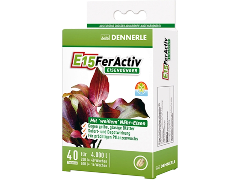 - Hnojivo s obsahem železa E15 FerActiv dodá akvarijním rostlinám okamžitě účinné dvojmocné železo a zajistí tak čerstvou, nádhernou zelenou barvu.