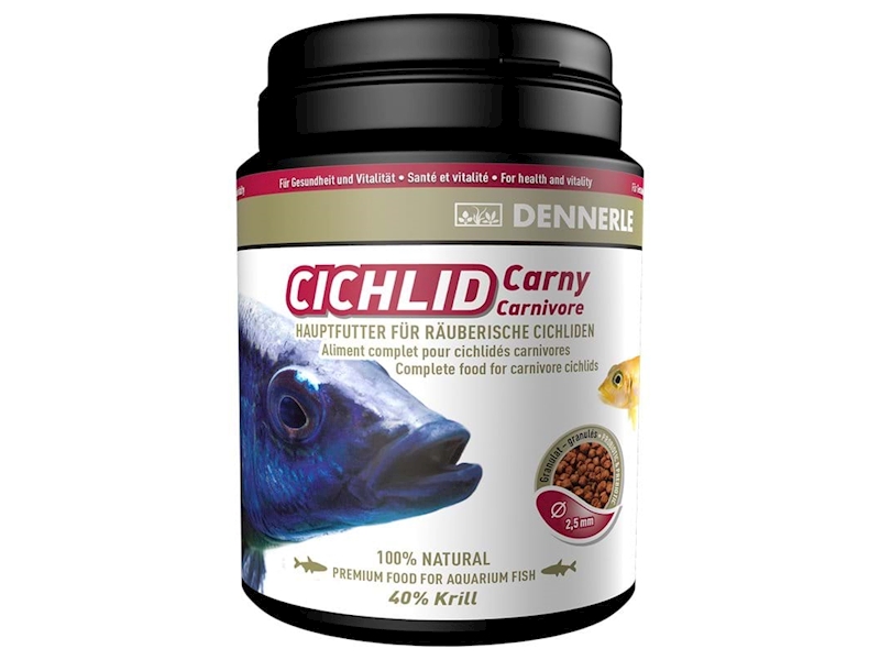 - CICHLID Carny se z 30 % skládá z hmyzu, korýšů a žábronožek, ze 40 % z krilu a jako třešničku na dortu obsahuje toto krmivo také slávku obecnou (3 %)