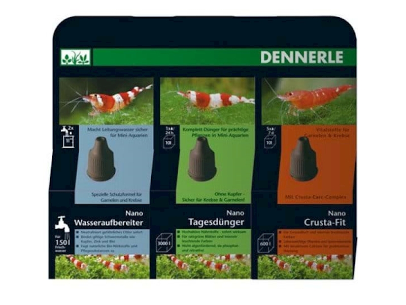 Sada Dennerle Nano Pflegeset obsahuje: hnojivo pro rostliny, minerály pro krevetky a roztok na úpravu vody.