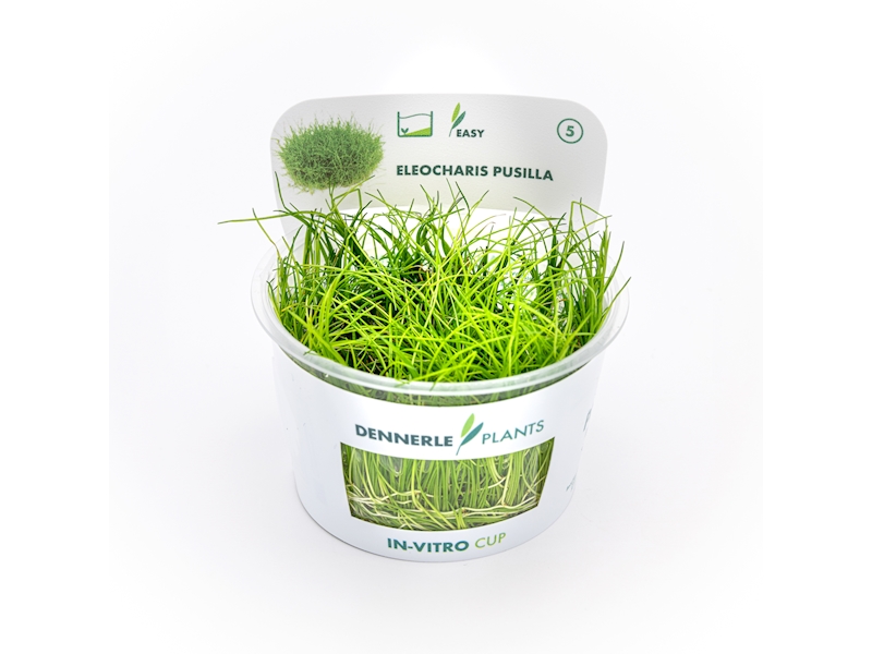 Trpasličí trávovitá rostlina Eleocharis pusilla s jehlicovitými listy pochází z Austrálie a Nového Zélandu, kde osídluje mokřady s rozdílnými hladinami vody. Výška růstu je oproti rostlině Eleocharis acicularis významně kratší, většinou dosahuje jen několika málo centimetrů. Dalším rozpoznávacím znakem jsou světle zelené lehce zahnuté stonky rostliny. Prospívá spíše v chladnější vodě, v permanentně vyšší teplotě převyšující 25°C nevydrží. Tato jemná kráska se znamenitě hodí k prezentaci svěží „letní louky“ ve stylu Iwagumi kamenných layoutů. Stejně jako ostatní trávníkovité rostliny doporučujeme i tento trpasličí druh kompletně zastřihnout. Dosáhnete ještě hustějšího a kompaktnějšího porostu.