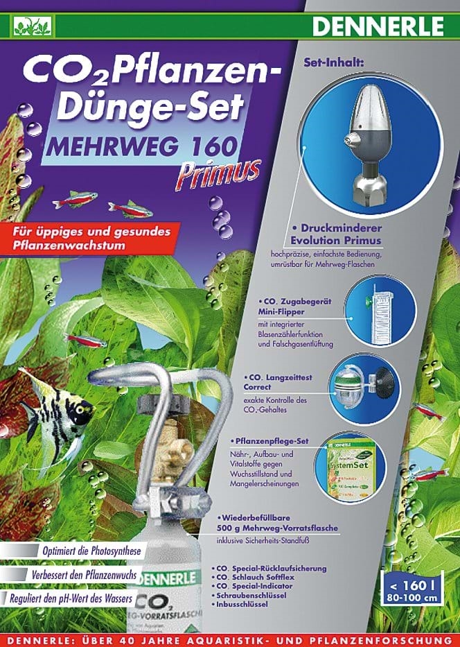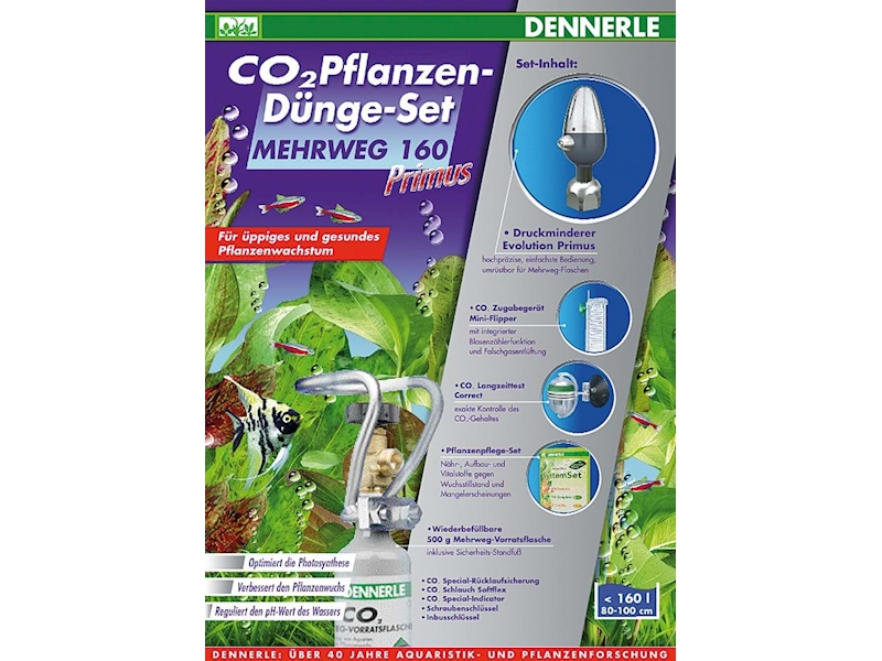 - Obzvláště vhodný způsob dodávání CO2 pro velká akvária či akvária se zvýšenou potřebou CO2. Pro tyto účely nabízí firma DENNERLE opakovaně plnitelné lahve až do 2 kg.