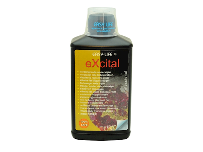 Excital potlačuje červené mazlavé řasy (bakterie Cyano) podporou růstu speciálních mikroorganismů na fotosenzitivních místech v akváriu. Červené mazlavé řasy už poté nemají šanci. Bezpečné pro všechny obyvatele akvária i biologický filtr.