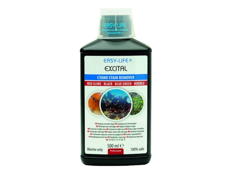 Excital potlačuje červené mazlavé řasy (bakterie Cyano) podporou růstu speciálních mikroorganismů na fotosenzitivních místech v akváriu. Červené mazlavé řasy už poté nemají šanci. Bezpečné pro všechny obyvatele akvária i biologický filtr.