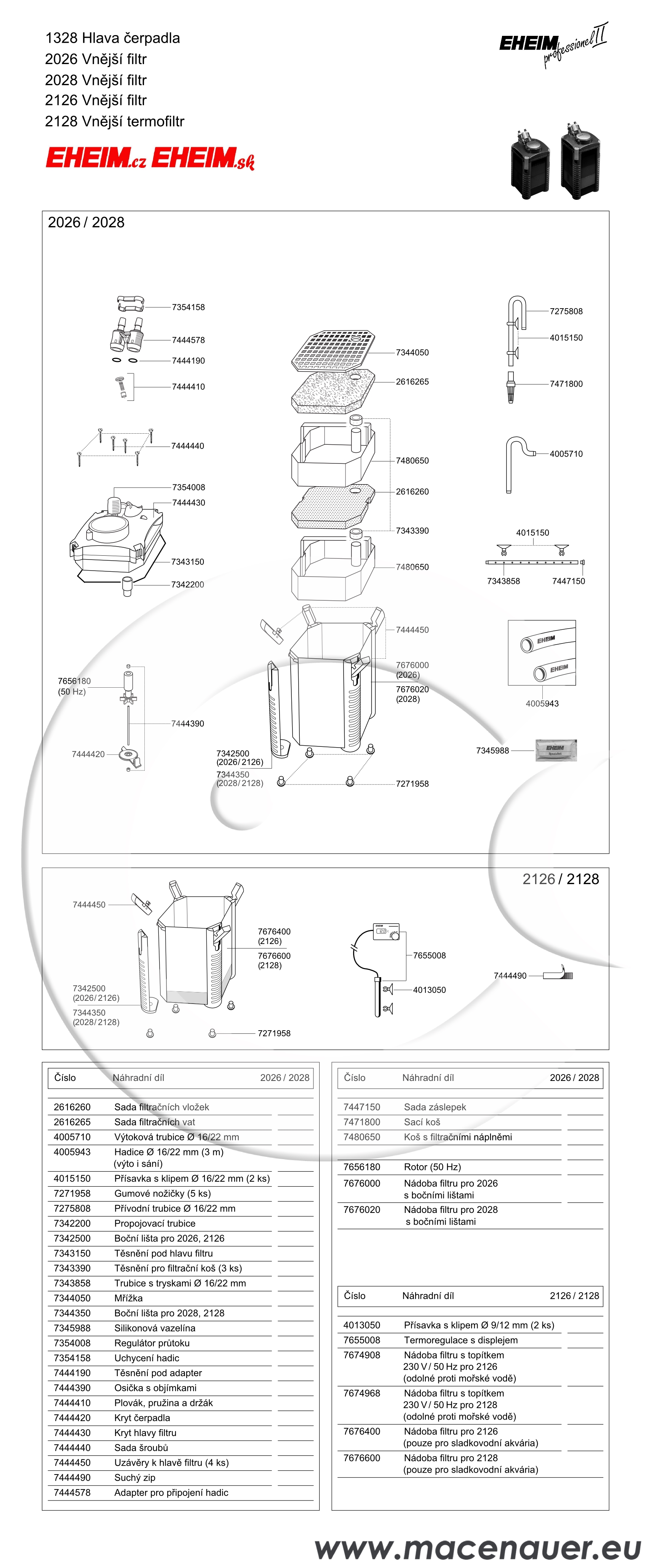 Druhá generace optimalizovaných vnějších filtrů splní všechna přání i těm nejnáročnějším akvaristům. Inovované filtry nové generace s perfektními funkcemi, rafinovanou technologií a provozní spolehlivostí se vyznačují absolutním komfortem a nejvyšší účinností. Jen jediné stlačení startéru aktivuje zabudovaný nasávací mechanizmus, který naplní vodou nádobu filtru včetně hadicového systému, buď po instalaci filtru, nebo po jeho obvyklém čištění. Integrované uzavírací kohouty se otvírají nebo uzavírají automaticky podle toho, zda je hadicový adapter odpojen nebo připojen k hlavě filtru. S pomocí kombi-páčky se dá regulovat podle přání průtok filtrem, přičemž je zajištěn hraniční průtok. Kontrolní průzor znázorňuje aktuální průtočné množství vody a současně signalizuje eventuální vzniklé poruchy v oběhovém systému filtru nebo upozorňuje na potřebu čištění filtru. Jednotlivé filtrační sady se dají pohodlně vyjmout a vyčistit. Hrubé a jemné filtrační vložky se postarají o přídavné mechanické čištění vody. Generace filtrů Eheim professionel II se dodává v provedení jako vnější filtry nebo termofiltry s integrovaným regulovaným topením a externím digitálním ukazatelem teploty.