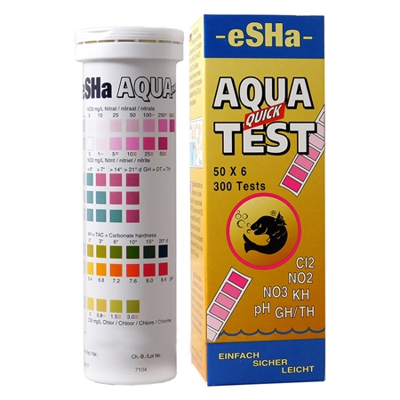 Se soupravou eSHa Aqua-Quick-Test můžete jedním rázem změřit hodnoty, které jsou kritické pro dobrou kvalitu vody: pH (kyselost), KH (karbonátová tvrdost), GH (celková tvrdost), NO2 (obsah dusitanů), NO3 (obsah dusičnanů) a Cl2 (obsah chlóru).
