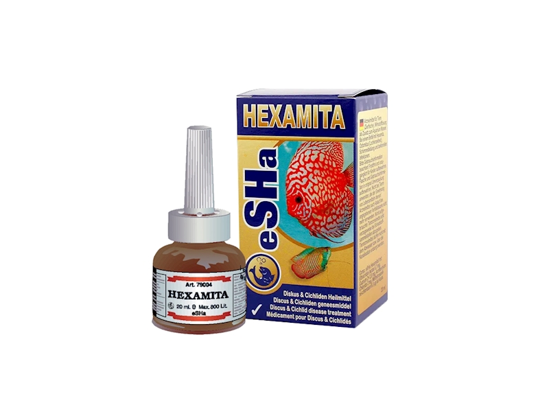 eSHa HEXAMITA představuje veterinární přípravek, kterého si chovatelé terčovců a cichlid obzvláště cení. Největší problém, se kterým se setkávají pěstitelé cichlid, terčovců, skalárů a tlamovců, jsou jejich často se vyskytující nemoci. Tím, že ryby nežijí v optimální vodě, snižuje se jejich odolnost a stanou se tak snadno obětí nejrůznějších parazitů jako je Octomitus, Hexamita atd. Ti způsobují onemocnění triviálně nazývané “děrovitost”. Přípravek eSHa HEXAMITA pozměňuje vodu akvária v příznivém smyslu pro ryby a má na ně velmi pozitivní vliv.