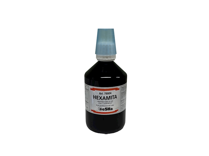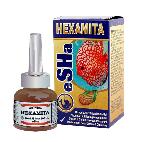 eSHa HEXAMITA představuje veterinární přípravek, kterého si chovatelé terčovců a cichlid obzvláště cení. Největší problém, se kterým se setkávají pěstitelé cichlid, terčovců, skalárů a tlamovců, jsou jejich často se vyskytující nemoci. Tím, že ryby nežijí v optimální vodě, snižuje se jejich odolnost a stanou se tak snadno obětí nejrůznějších parazitů jako je Octomitus, Hexamita atd. Ti způsobují onemocnění triviálně nazývané “děrovitost”. Přípravek eSHa HEXAMITA pozměňuje vodu akvária v příznivém smyslu pro ryby a má na ně velmi pozitivní vliv.