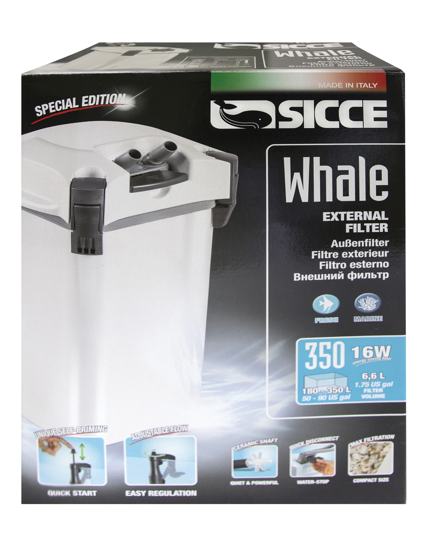 Prvně představujeme nové vnější filtry SICCE Whale v bílé barvě s jednoduchým řešením pro spouštění filtru (Quick Start) a praktickým odpojováním hadic (Quick Disconnect). Již nikdy se k Vašemu filtru nebudete muset ohýbat! Jedinečná regulace filtru (Easy Regulation) je chytře umístěna u vrchní hrany akvária. Série filtrů SICCE Whale je extrémně tichá, energeticky úsporná a vyznačuje se vysokou filtrační kapacitou. Vnější filtry SICCE Whale, pro sladkovodní a mořská akvária, jsou dodávány s kompletním příslušenstvím a účinným filtračním materiálem. Shrnuto a podtrženo, jedná se o řadu nejmodernějších vnějších filtrů na světě!