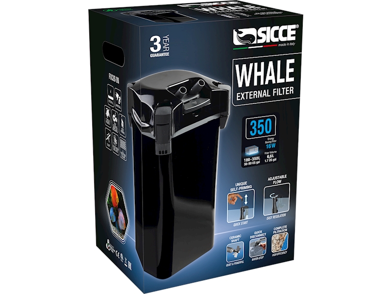Prvně představujeme nové vnější filtry SICCE Whale "Black Edition" s jednoduchým řešením pro spouštění filtru (Quick Start) a praktickým odpojováním hadic (Quick Disconnect). Již nikdy se k Vašemu filtru nebudete muset ohýbat! Jedinečná regulace filtru (Easy Regulation) je chytře umístěna u vrchní hrany akvária. Série filtrů SICCE Whale je extrémně tichá, energeticky úsporná a vyznačuje se vysokou filtrační kapacitou. Vnější filtry SICCE Whale, pro sladkovodní a mořská akvária, jsou dodávány s kompletním příslušenstvím a účinným filtračním materiálem. Shrnuto a podtrženo, jedná se o řadu nejmodernějších vnějších filtrů na světě!