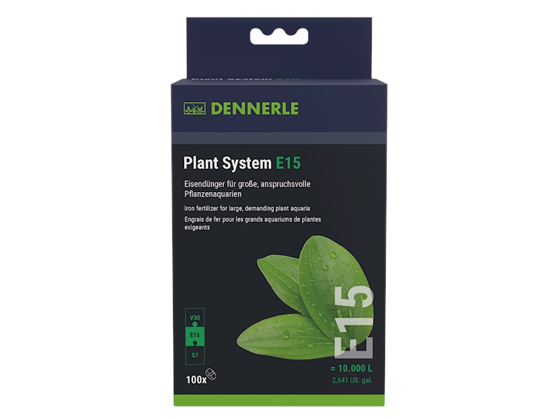 Dennerle Plant System E15 je železové hnojivo ve formě tablet pro vodní rostliny. Plant System E15 zásobuje všechny akvarijní rostliny okamžitě účinným dvojmocným živným železem a zajišťuje tak svěží, nádhernou zeleň. Příznaky nedostatku jako žluté, sklovité listy jsou z velké části vyléčeny, mladé listy raší opět sytě zeleně.
