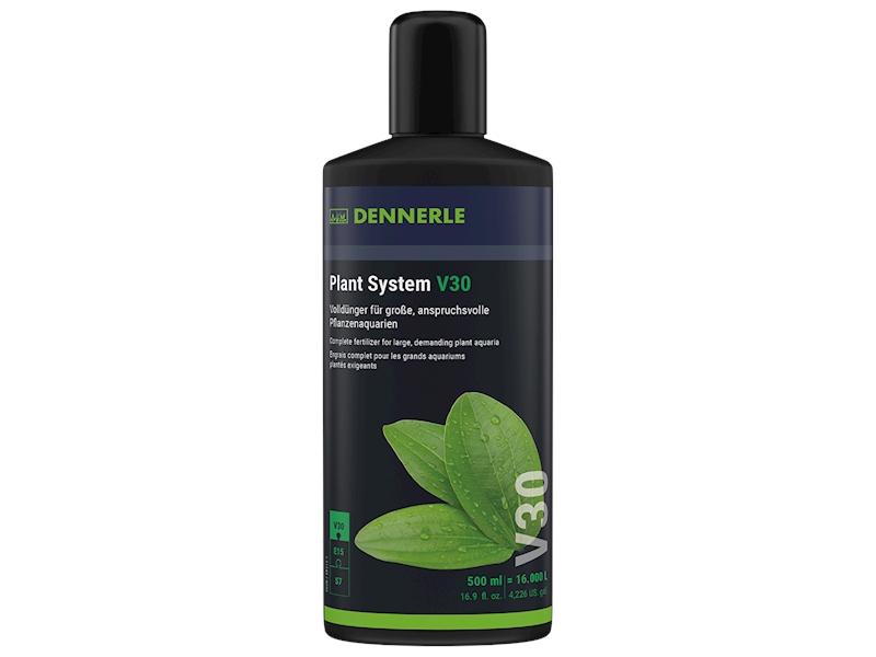 S rostoucí velikostí akvária roste i množství a velikost rostlin. Z tohoto důvodu jsme vyvinuli náš rostlinný systém, systém s vysoce koncentrovanými komponenty. Komponenty Plant System V30 (kompletní hnojivo), Plant System S7 (životně důležité látky) a Plant System E15 (železné hnojivo) jsou proto vyvinuty tak, aby vyhovovaly potřebám velkých akvárií. Zahrnuje všechny makro- a mikroživiny i stopové prvky. Plant System V30 bojuje s nedostatkem živin, posiluje rostliny zevnitř a pomáhá čelit stagnujícímu růstu. Vysoce účinné ochranné obaly – tzv. cheláty – znamenají, že živiny zůstávají rostlinám k dispozici po dlouhou dobu. Příznaky nedostatku jsou trvale vymýceny, nové listy opět vykazují sytě zelené zbarvení. Bez fosfátů a dusičnanů.