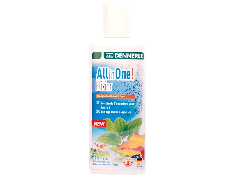 Na základě těchto skutečností a s více než 50letými zkušenostmi s pěstováním vodních rostlin, stejně jako s hlubokým porozuměním biologickým reakcím probíhajícím v akváriích, vyvinula firma Dennerle nový a komplexní produkt péče o celé akvárium: All in One! Elixier. Ten dodává akváriu 12 navzájem pečlivě sladěných aktivních látek: uhlík, železo, živiny pro rostliny, stabilizátory živin, aminokyseliny, vitamíny, stopové prvky, bylinné extrakty, aloe vera, dexpanthenol, jód a posilovače filtru.