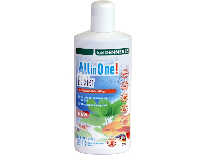 Na základě těchto skutečností a s více než 50letými zkušenostmi s pěstováním vodních rostlin, stejně jako s hlubokým porozuměním biologickým reakcím probíhajícím v akváriích, vyvinula firma Dennerle nový a komplexní produkt péče o celé akvárium: All in One! Elixier. Ten dodává akváriu 12 navzájem pečlivě sladěných aktivních látek: uhlík, železo, živiny pro rostliny, stabilizátory živin, aminokyseliny, vitamíny, stopové prvky, bylinné extrakty, aloe vera, dexpanthenol, jód a posilovače filtru.