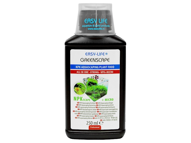 GreenScape je profesionální hnojivo pro akvária s (mnoha) rostlinami a malým počtem ryb nebo bez nich. GreenScape je kompletní hnojivo NPK+ s vysokým obsahem dusičnanů, fosforečnanů, draslíku, železa, manganu a mnoha dalších nezbytných stopových prvků (včetně V, B, Co, Li, I, Mo, Ni, Sn, Al, Zn, Se).