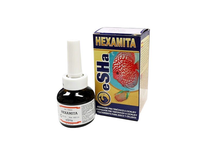 eSHa HEXAMITA představuje veterinární přípravek, kterého si chovatelé terčovců a cichlid obzvláště cení. Největší problém, se kterým se setkávají pěstitelé cichlid, terčovců, skalárů a tlamovců, jsou jejich často se vyskytující nemoci. Tím, že ryby nežijí v optimální vodě, snižuje se jejich odolnost a stanou se tak snadno obětí nejrůznějších parazitů jako je Octomitus, Hexamita atd. Ti způsobují onemocnění triviálně nazývané “děrovitost”. Přípravek eSHa HEXAMITA pozměňuje vodu akvária v příznivém smyslu pro ryby a má na ně velmi pozitivní vliv.