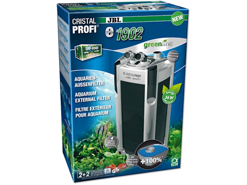 - Se spotřebou 36 W je CristalProfi e1902 velmi energeticky úsporný. Při konstantně účinné cirkulaci vody přístroj spotřebovává o 27 % méně energie než jiné srovnatelné předchozí modely. Patentovaný blok pro připojení hadic s bezpečnostním ventilem brání úniku vody při odpojování filtru. JBL CristalProfi je schválen zkušebnou TÜV.