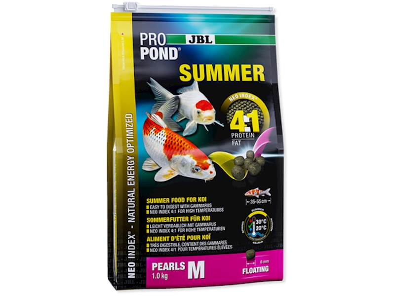 - S kukuřicí, lososem, sójou, garnáty, gammarus a řasou spirulina pro silné a zdravé koi (při teplotě vody 20-30 °C)