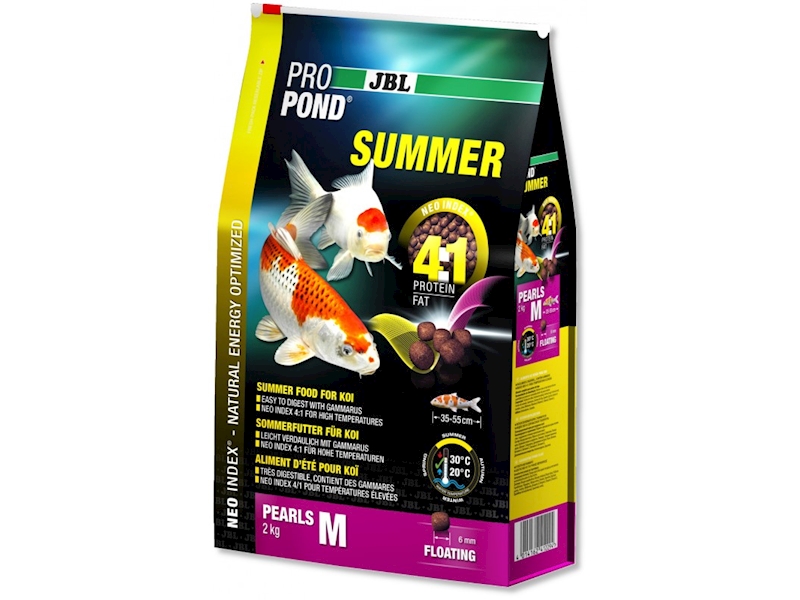 - S kukuřicí, lososem, sójou, garnáty, gammarus a řasou spirulina pro silné a zdravé koi (při teplotě vody 20-30 °C)
