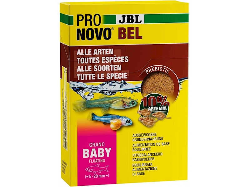 JBL PRONOVO BEL GRANO BABY je jemné práškové krmivo určené pro mladé akvarijní rybky (velikost cca 5–10 mm). Krmivo je plnohodnotné, s vyváženým obsahem živin potřebných pro zdravý růst a vývoj od nejranějšího věku. Díky jemné práškové formě je snadno stravitelné – ideální i pro velmi malé nebo čerstvě vylíhnuté rybky.