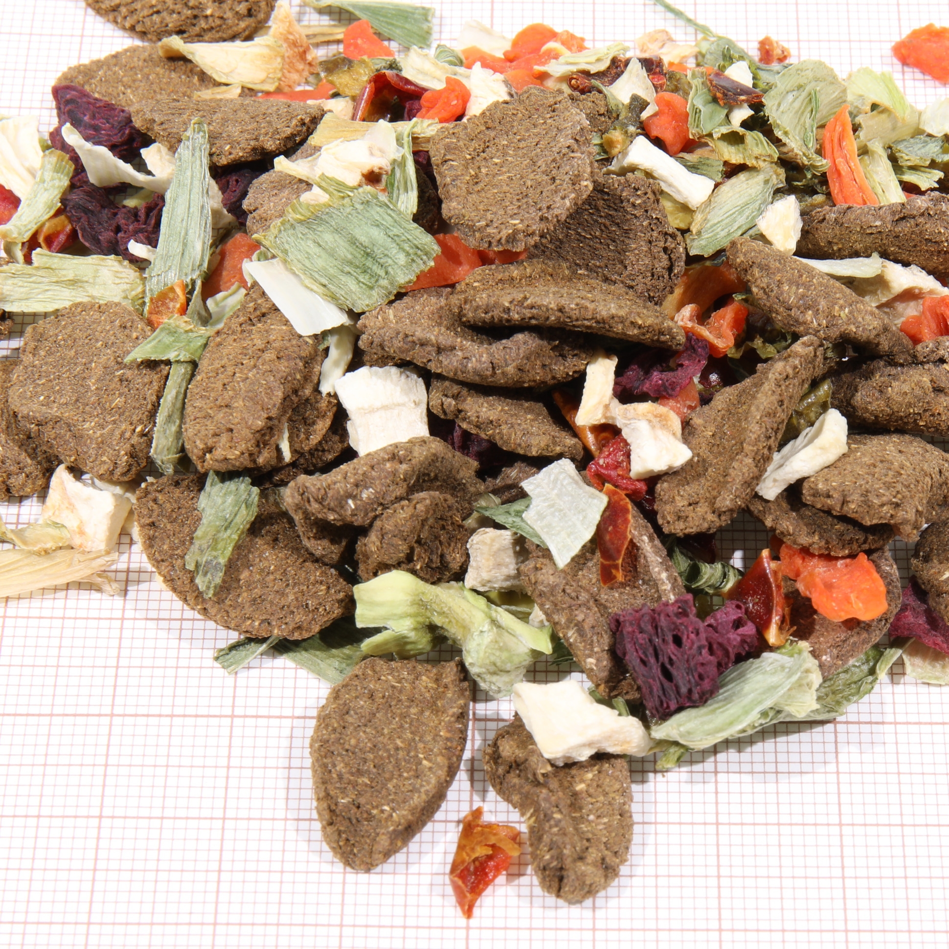 - 54 % zeleniny pro zdravou stravu bohatou na vitamíny. Vyvážená směs šetrně sušené zeleniny s čistým zeleninovým extrudátem