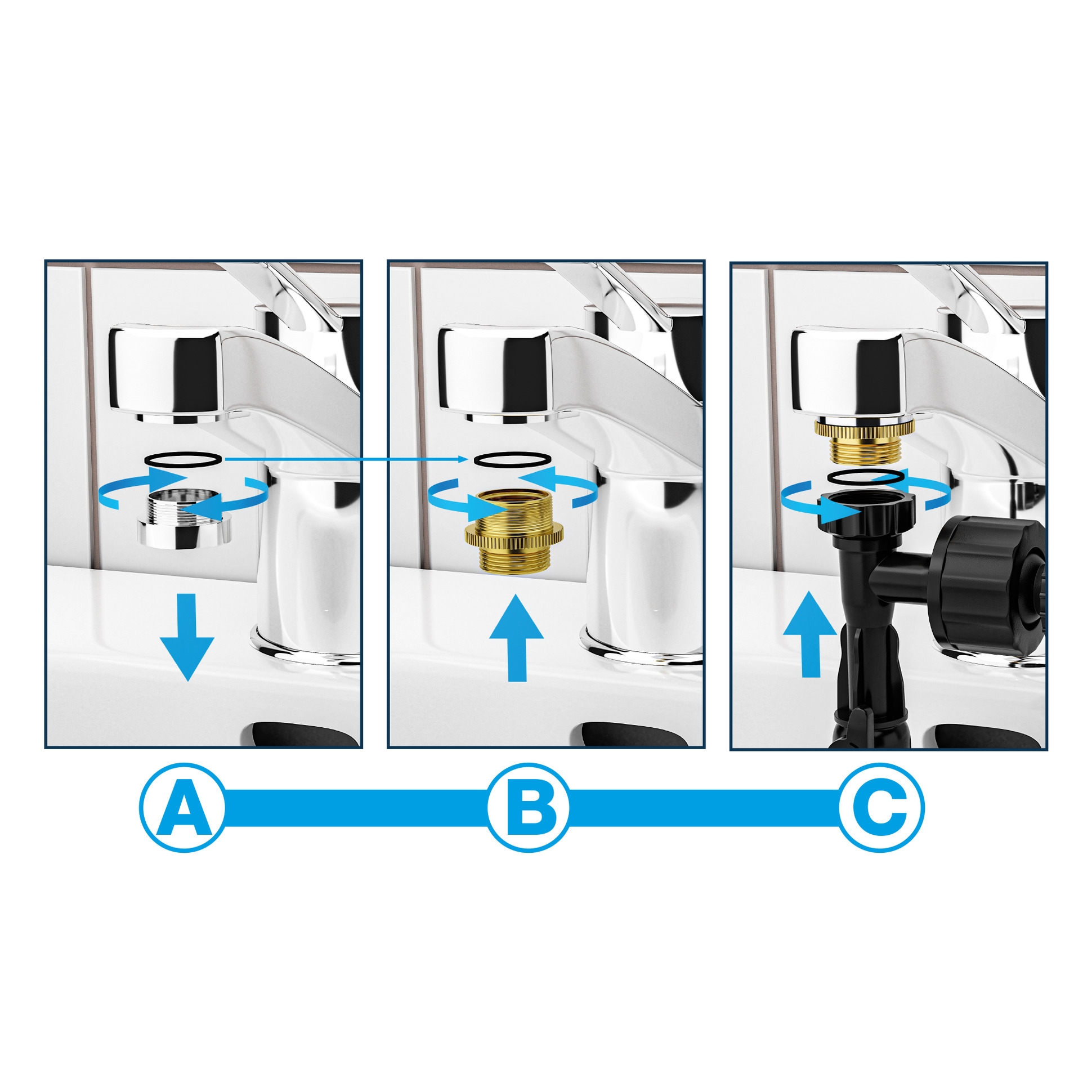 - Pumpa má závitovou přípojku 3/4''. Pomocí adaptéru (není součástí dodávky) se musí připojit k závitu vodního kohoutku (většinou M28x1; M22x1; M24x1)