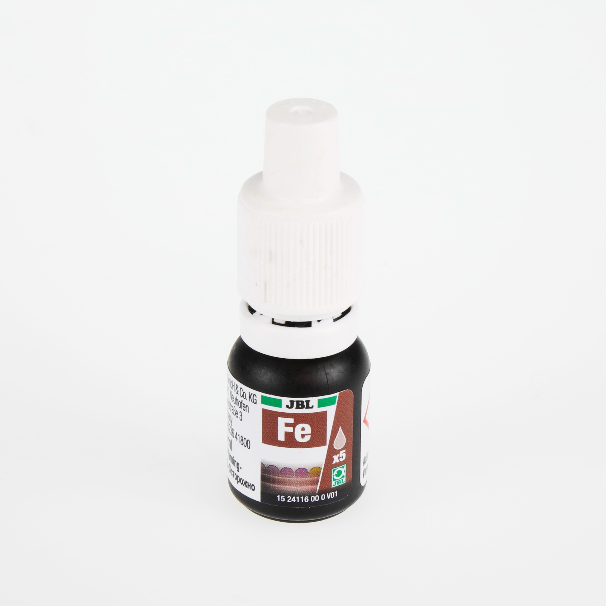- 1 test železa. Obsah na cca 50 měření, vč. činidla, 2 skleněných kyvet se šroubovým uzávěrem, stříkačkou, komparačním blokem a barevnou stupnicí. Náhradní činidlo se dodává zvlášť.