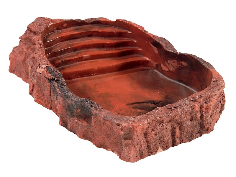 Misky na pitnou vodu a na koupání. Imitace skal. Stupínky chrání zvířata před utonutím.
