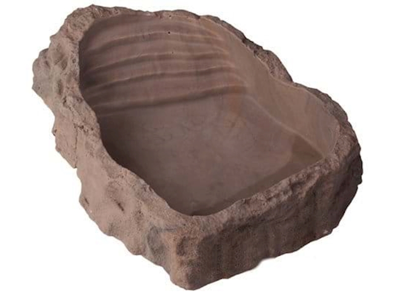 Misky na pitnou vodu a na koupání. Imitace skal. Stupínky chrání zvířata před utonutím.