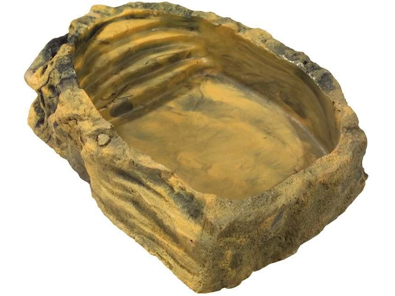 Misky na pitnou vodu a na koupání. Imitace skal. Stupínky chrání zvířata před utonutím.