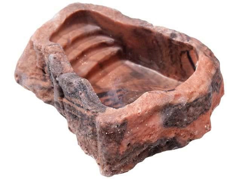 Misky na pitnou vodu a na koupání. Imitace skal. Stupínky chrání zvířata před utonutím.
