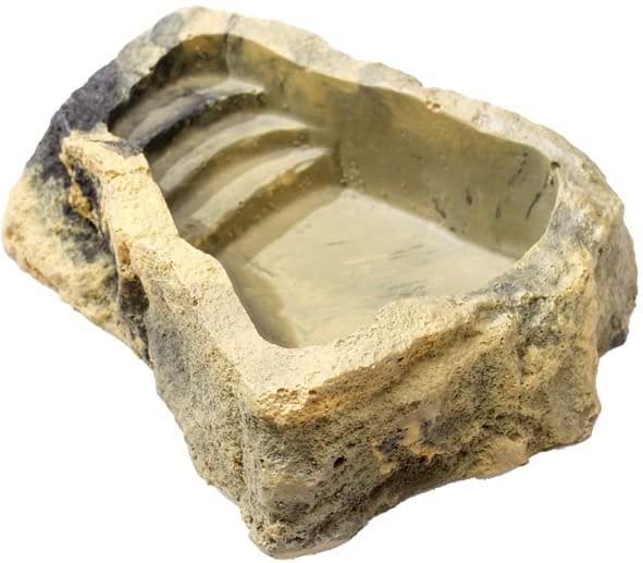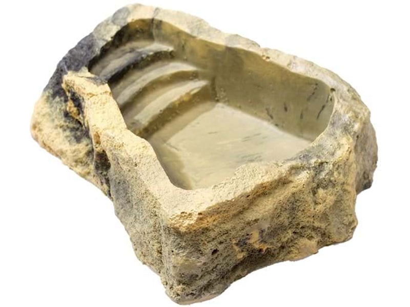 Misky na pitnou vodu a na koupání. Imitace skal. Stupínky chrání zvířata před utonutím.