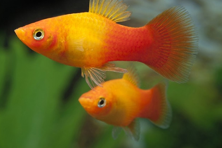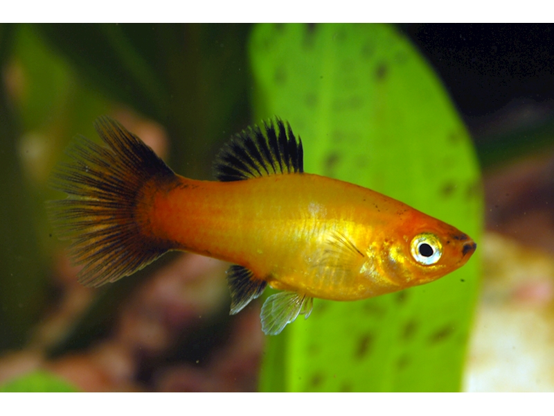 Pohlaví: Pohlaví je rozeznatelné na první pohled, samci mají krátký pohlavní orgán - gonopodium (v kopulační orgán přeměněná řitní ploutev samců ryb z čeledi živorodkovitých). Samice jsou robustnější, plnější v bříšku. Samci jsou o trochu menší a štíhlejší. Existuje velké množství barevných variet, které se liší jak zbarvením tak tvarem ploutví. Lze se setkat také s množstvím kříženců, především s mečovkami.